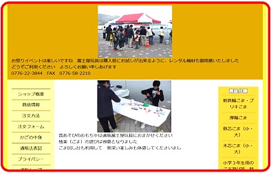 | こんにちは! 店長の藤井(ふじい)です ^^。 当店の屋号は冨士屋玩具です、ふじやがんぐと読んでください 創業は 1948年(昭和23年)です。「懐かしいけど、新しい。」を心がけて事業を展開しています このサイトは、独楽(こま)・おまつりグッズ.など、昔ながらのおもちゃ専門のネットショップです。 一品の商品選びから、子ども会や地域のお祭り用の組み合わせまで、お気軽にご相談ください。 |